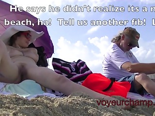 Бесстыжая тетка на пляже широко раздвигает ноги перед отдыхающими